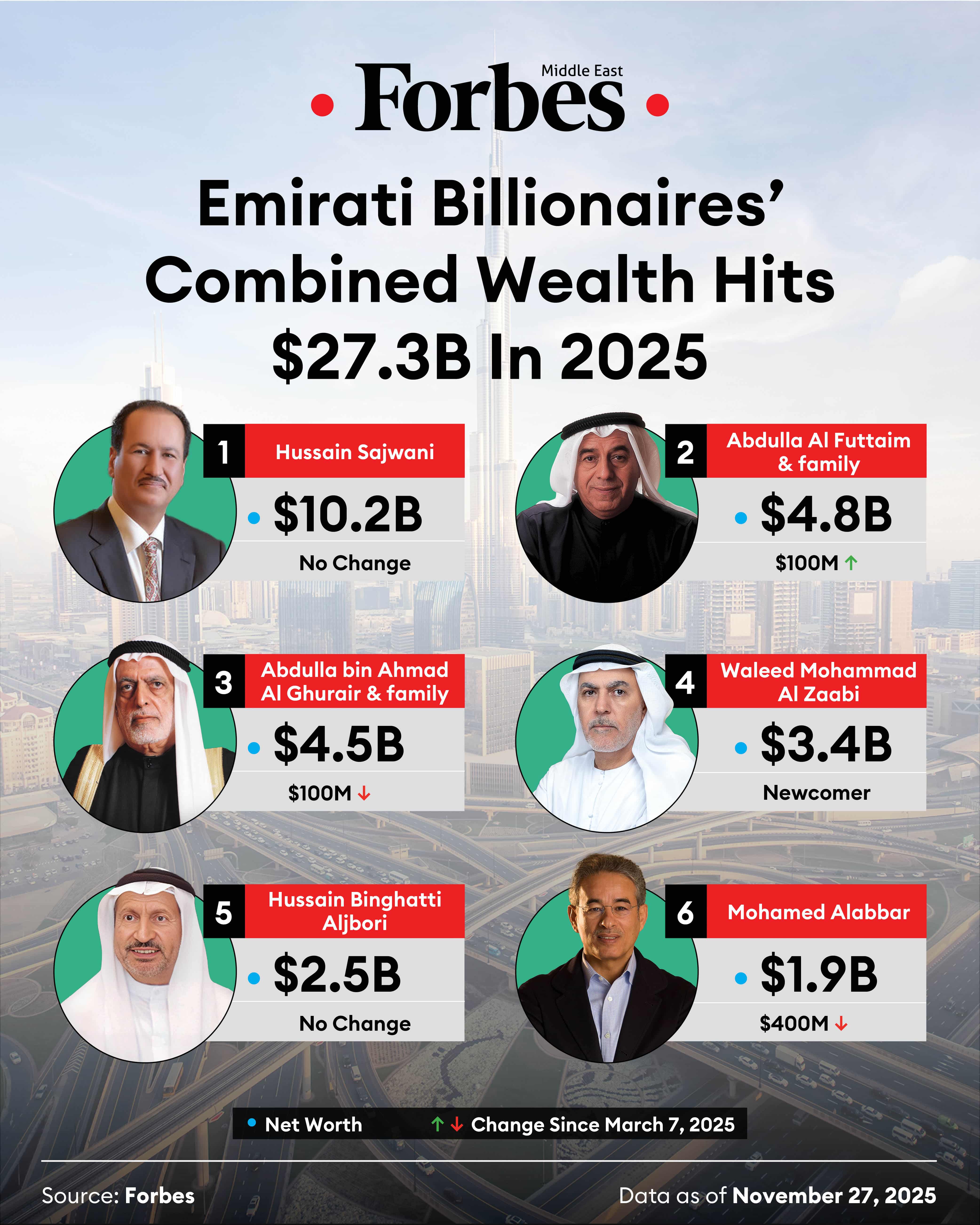 As the UAE celebrates its National Day in early December, the nation’s six billionaires showcase their enduring strength, collectively holding a net worth of $27.3 billion as of November 27, 2025, reflecting the resilience and dynamism of the country’s wealthiest.